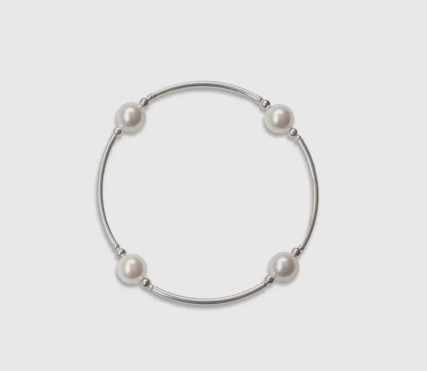 Elegant Sterling Silver Gratitude Bracelet; 8 MM White pearl and Sterling Silver Links, Strung on Stretch Nylon