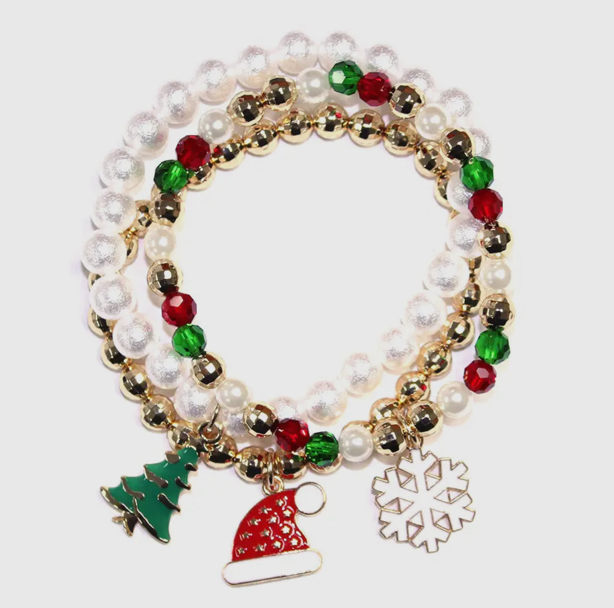 From the fashion-forward house of What's Hot, we bring you our Pearl, Red/Green, and Gold Set of Three Stretch Bracelets with Christmas Charms. This set embodies the festive spirit, boasting a vibrant mix of colors and charming Christmas-themed charms. Designed for the stylish and trend-savvy, these bracelets are a delightful addition to your holiday ensemble. Perfect for gifting or to treat yourself, these pieces embody our commitment to providing trendy yet affordable accessories
