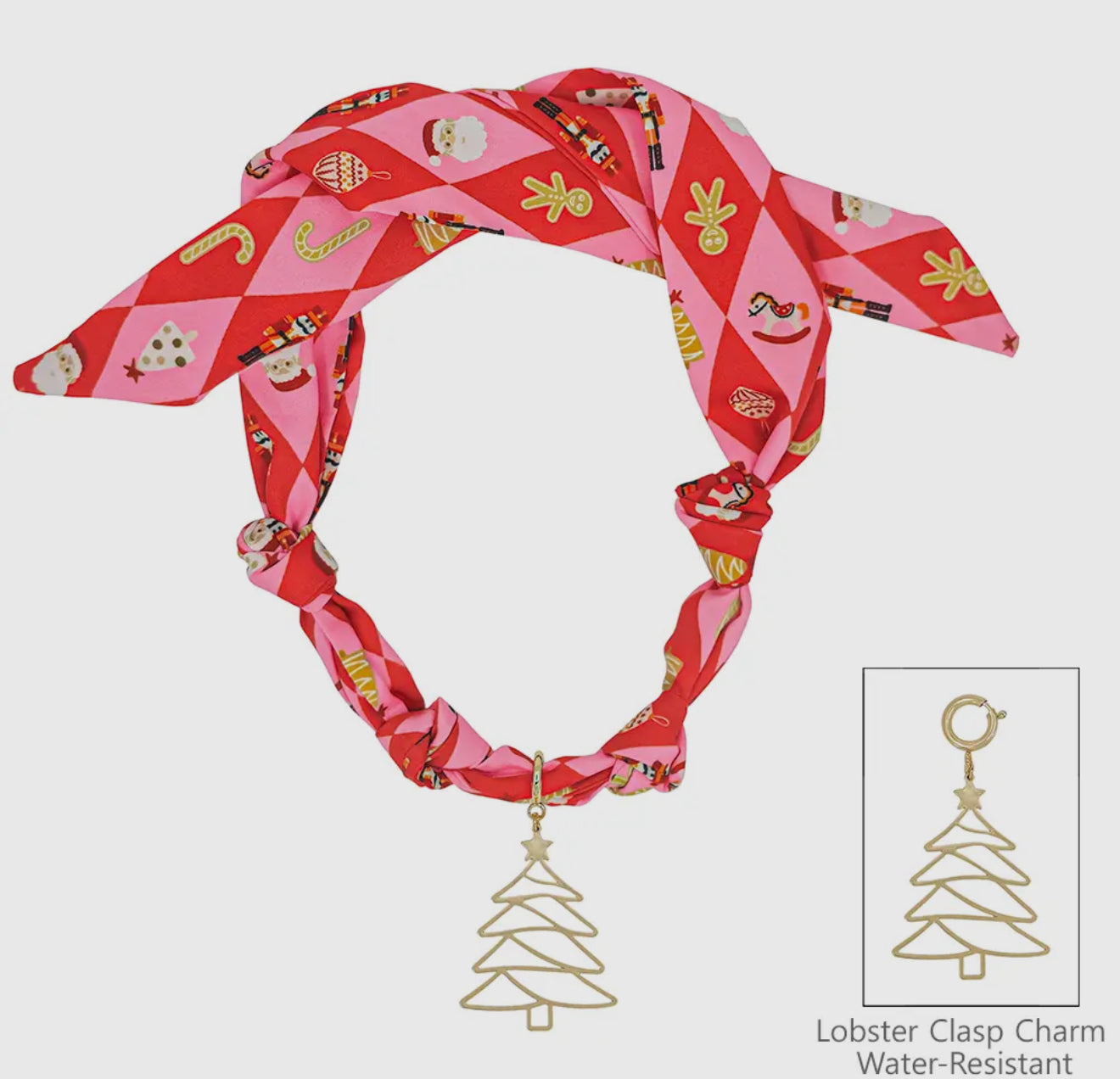Christmas Printed Silk Knotted Scarf Necklace W/ Tree Charm