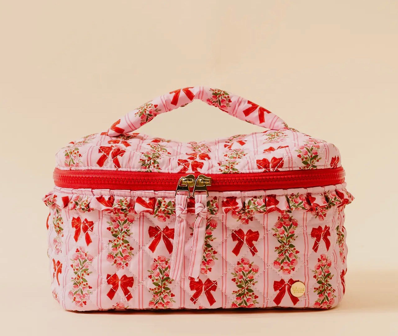 Simplify your routine with our Glam & Go Quilted Cosmetic Bag. Crafted from soft, quilted fabric with a sturdy handle, this bag features an all-around gold double zipper for easy access. Inside, the signature darling wipeable interior lining keeps everything neat and organized. It's perfectly sized to carry your must-haves, whether you're traveling, running errands, or just need a stylish way to keep your essentials in place. Fits every step of your routine Soft, quilted fabric with handle All around gold double zipper Signature darling wipeable interior lining Dims: 11"l x 6"w x 6"h