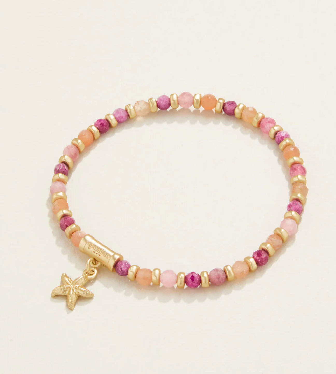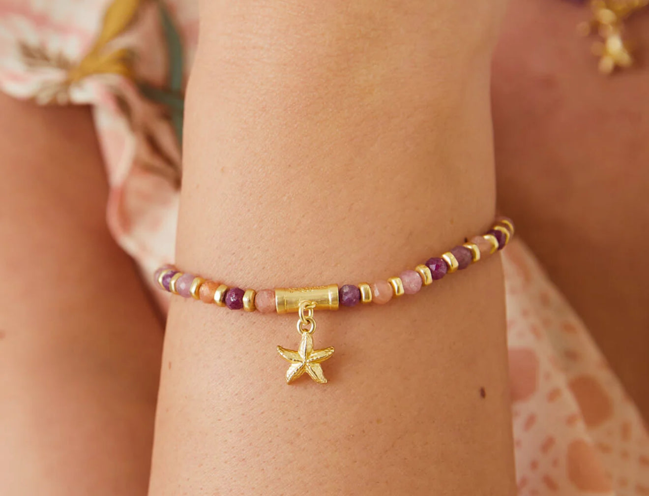 Ready to fit any wrist and perfect for stacking, this cool pink and purple stretch bracelet is made with natural ruby, sunstone and tourmaline beads and topped with a starfish charm.