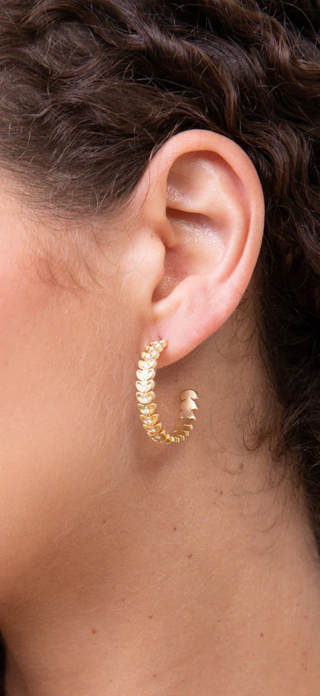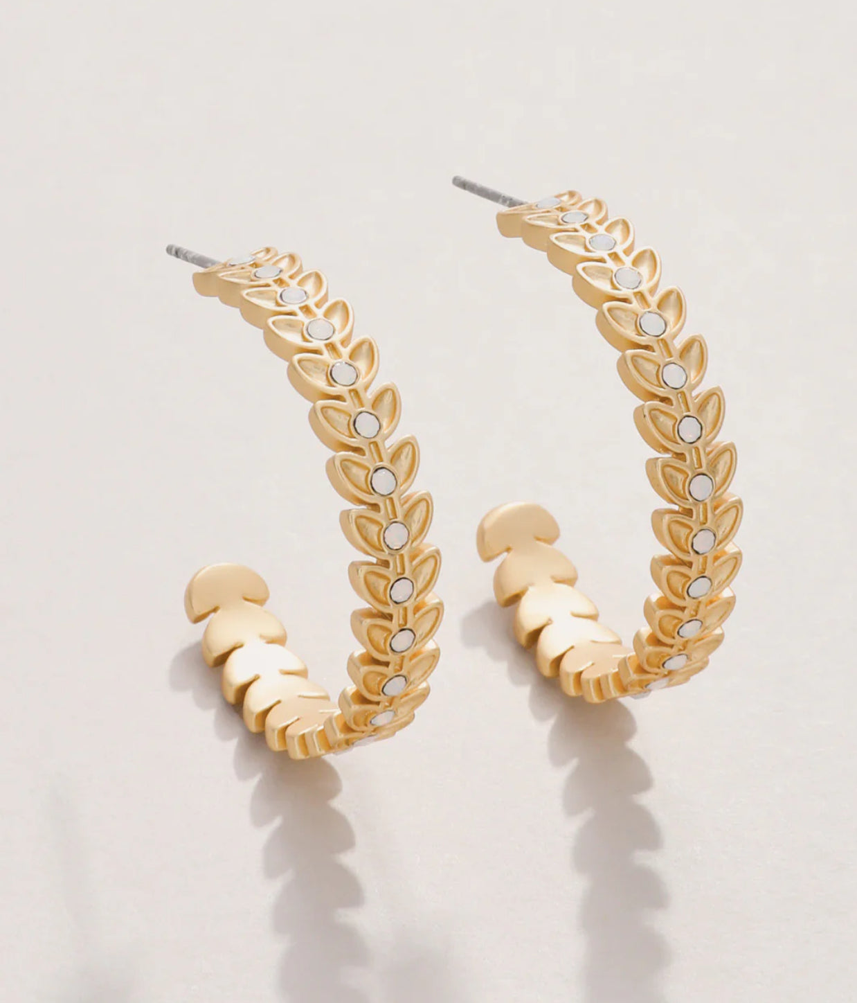 Your look isn't complete without these darling hoops! Natural style with a little extra glam, our Parkwood Hoop Earrings stun in 18kt matte gold plated petals with sparkling white opal glass crystal.