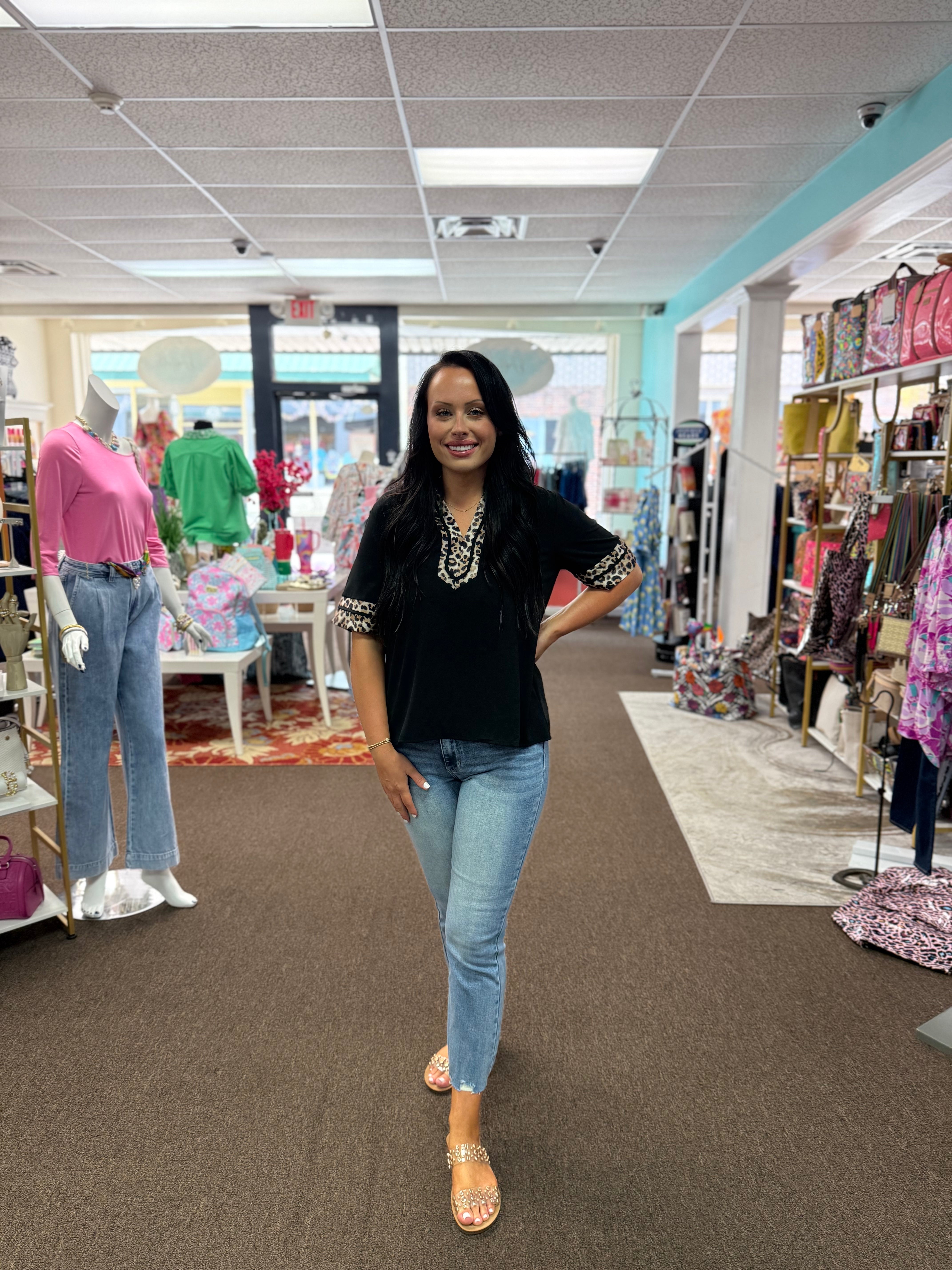 Embrace effortless style with the Happy To Be Here Top. This lightweight woven short sleeve features a playful leopard-patterned caftan-inspired band collar and sleeve bands, adding a wild twist to your everyday look. Unlined and non-sheer, it keeps you comfortable and confident all day long. Perfect for those who love a touch of fun in their wardrobe!