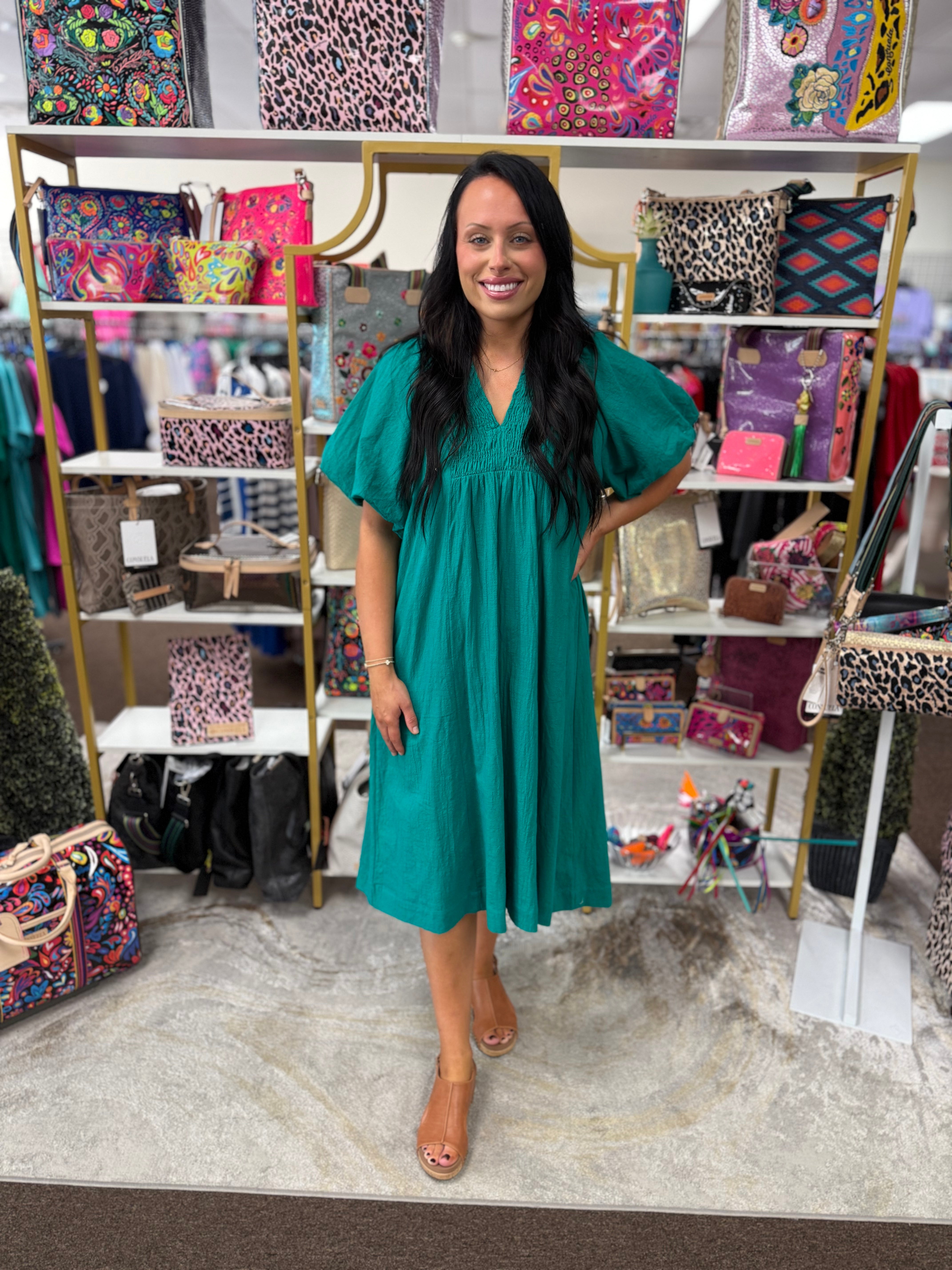 Get ready to fall head over heels for our Jaded Love Dress! Its relaxed and flowy fit is perfect for any occasion, while the smocked bodice and deep V-neck with collar add a touch of romance. With a midi length and puff sleeves (lined for added comfort), this dress is sure to become your new go-to.