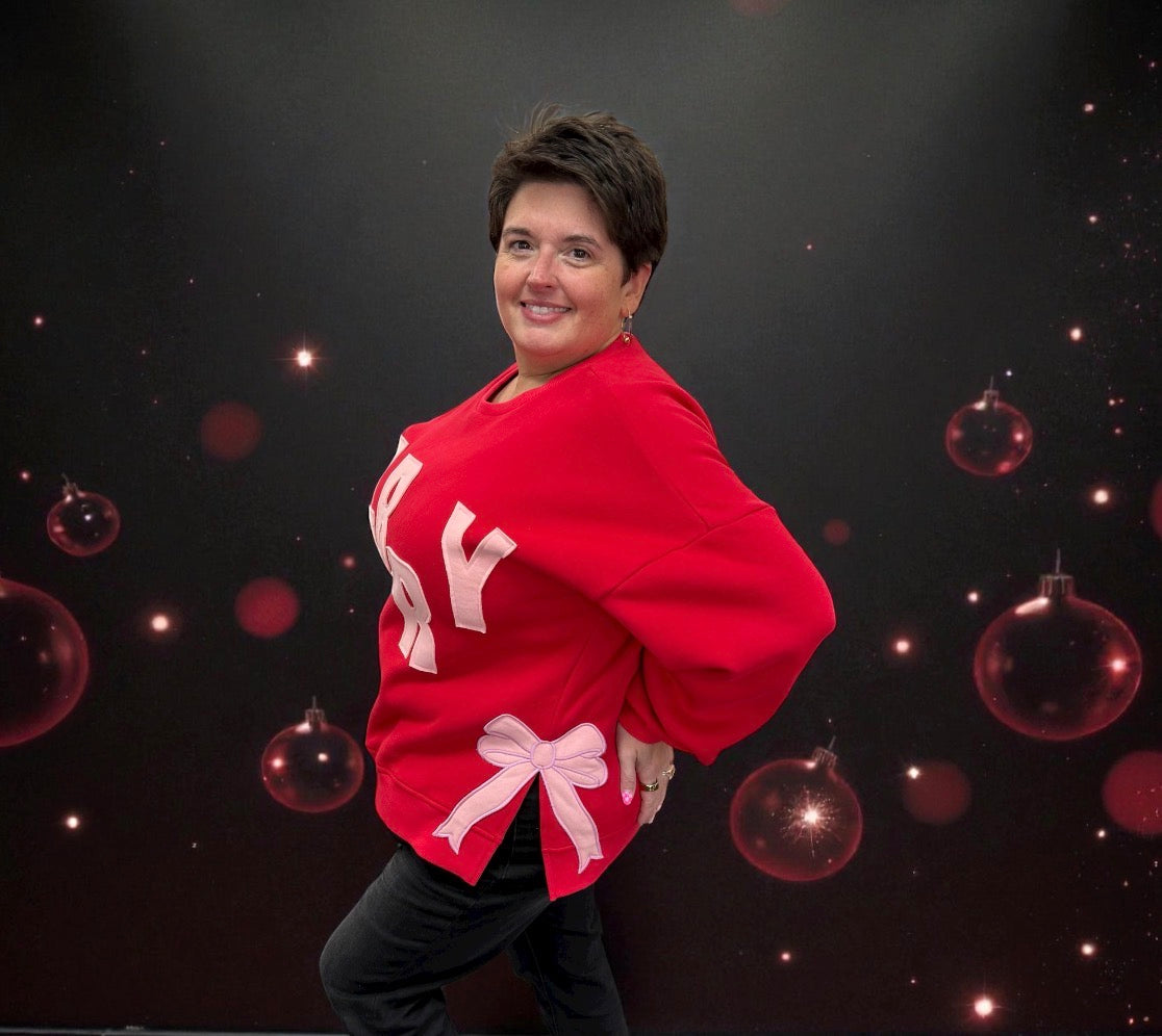 MERRY AND SIDE BOW PATCHES CHRISTMAS FLEECE SWEATSHIRTSELF 52%COTTON 48%POLYESTERCONT 52%COTTON 48%POLYESTERtrue to size