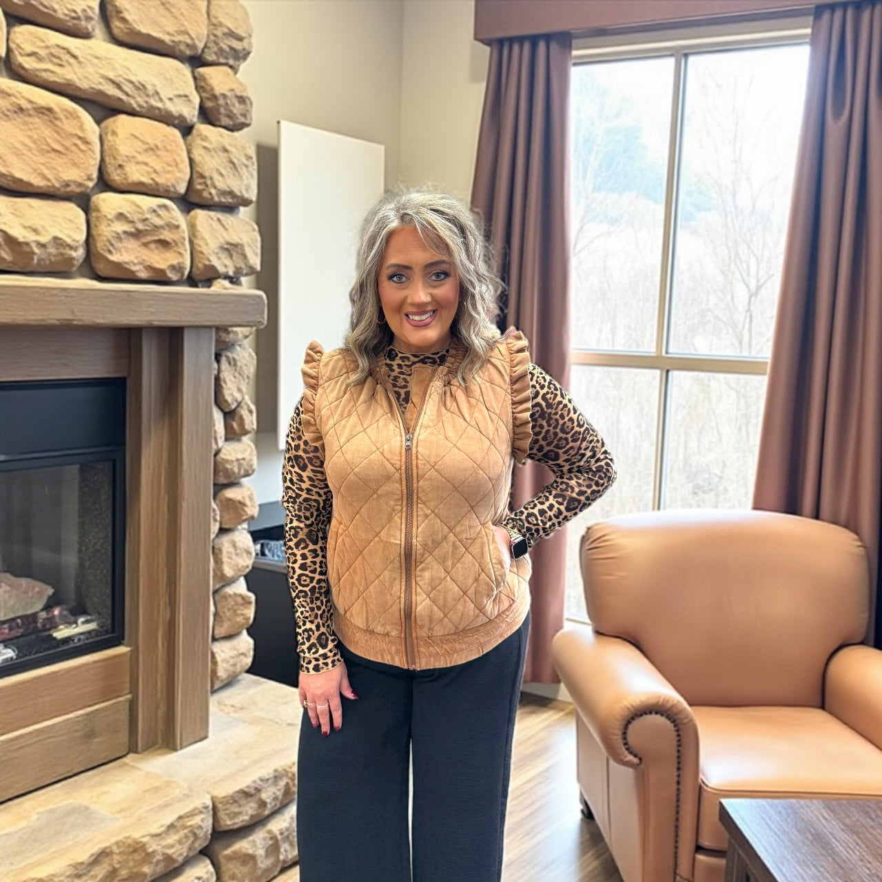 Whether you're heading to the farmer’s market, grabbing brunch, or just taking a crunchy leaf stroll, this vest has your back (literally). The quilted texture adds warmth without weighing you down, and the ruffled shoulders? Total soft girl vibes. Trust us—this is the vest you didn’t know you needed, but won’t stop wearing.