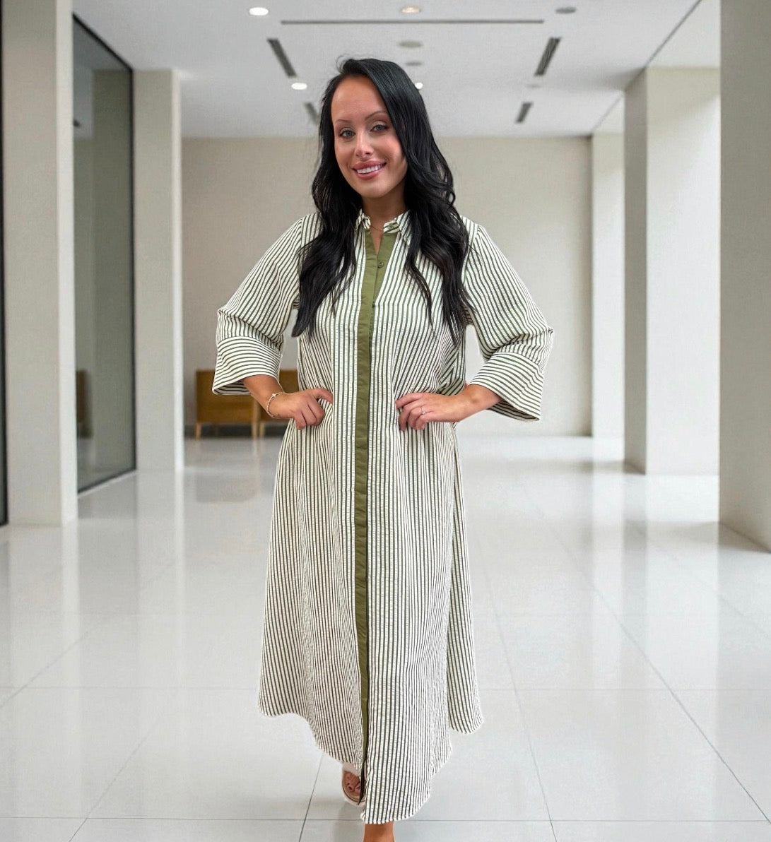 Striped 3/4 sleeve Midi dress featuring hidden button closure at front. Shirt collar. Side pockets. Unlined. Woven. Non-sheer. Lightweight.