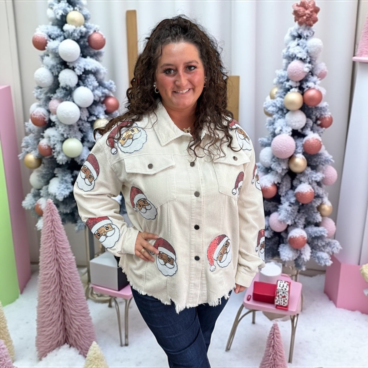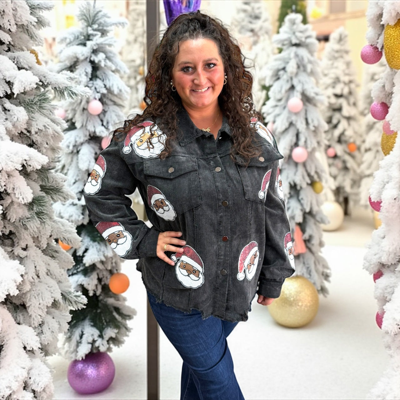• The Sequin Santa Cropped Corduroy Shacket is trendy and eye-catching!like a trendy  The combination of corduroy fabric and sequin patches of Santa faces adds a playful and festive touch to the garment. The cropped length adds a modern twist, making it perfect for layering over tops or dresses.