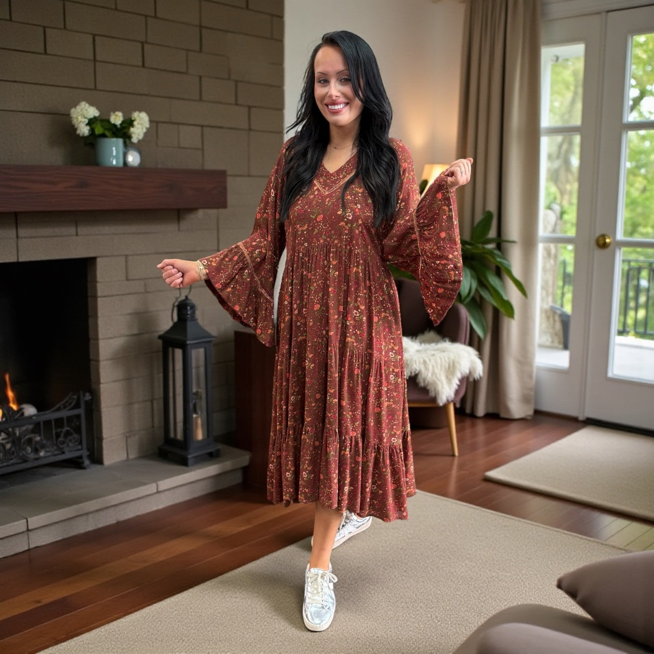 FLORAL PRINTED RAYON GAUZE DRESS -FLOWY MIDI LENGTH SILHOUETTE -LONG BELL SLEEVES -V NECKLINE -TIE CLOSURE AND TASSEL DETAIL -RELAXED, BOHEMIAN STYLE FIT -POCKETS ON BOTH SIDES -PERFECT FALL DRESSES