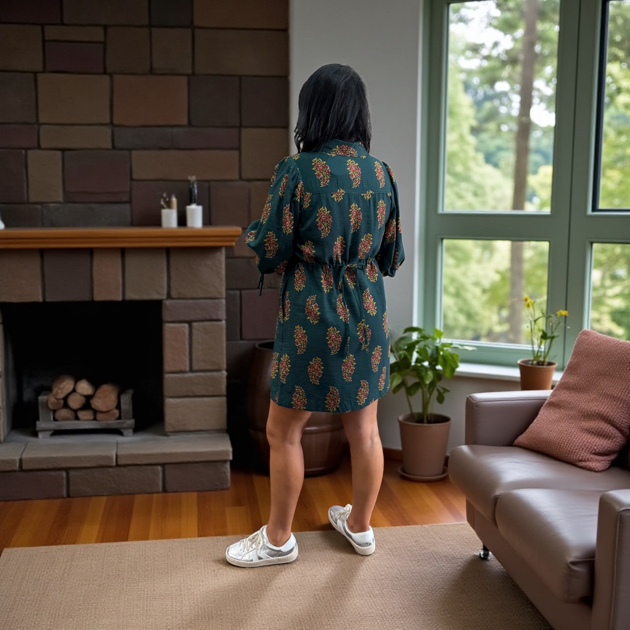 Floral print puff sleeve mini dress featuring drawstring tie at cuffs and back waist. Side pockets. Lined. Woven. Non-sheer. Lightweight.
