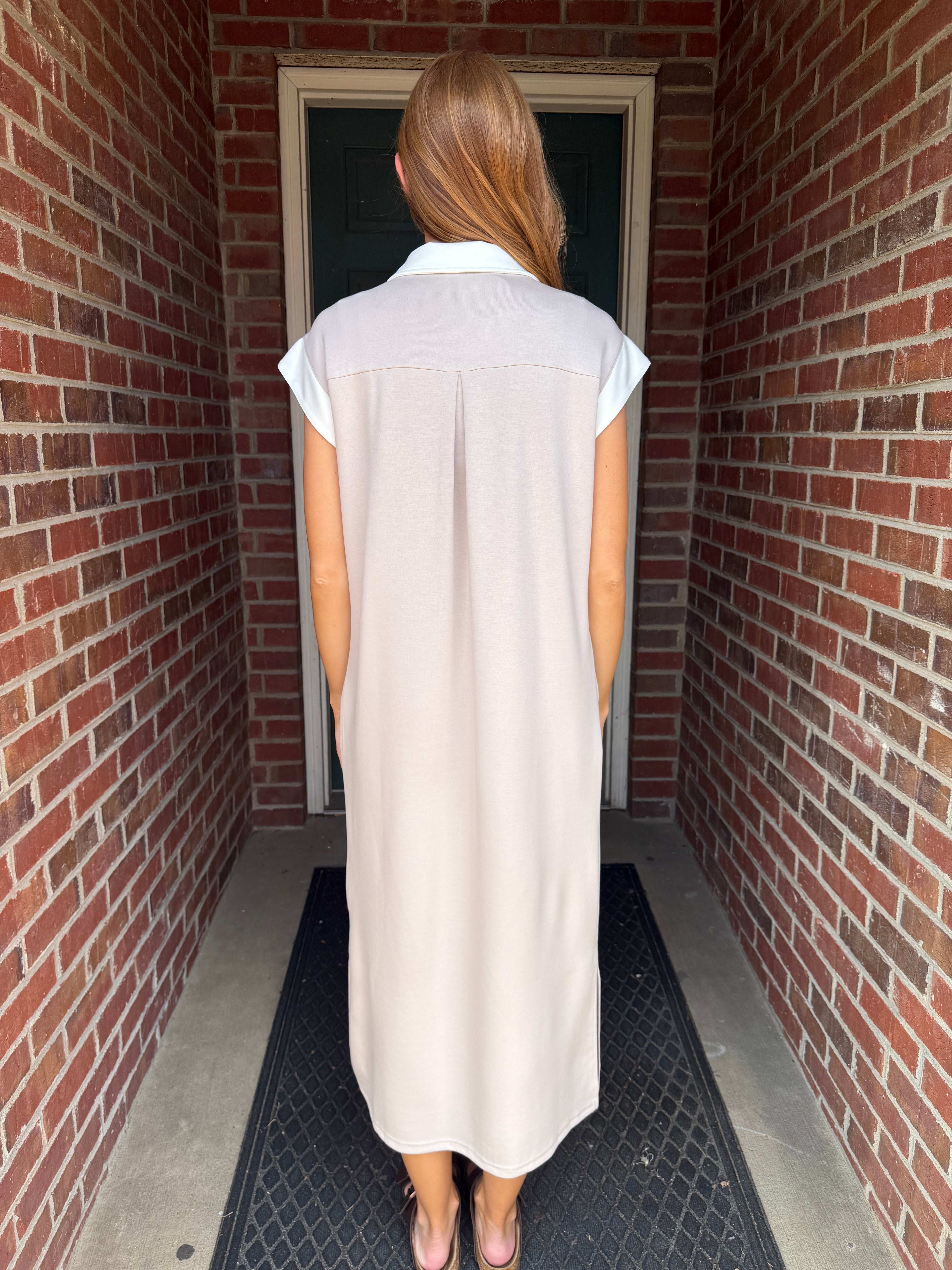 Effortless elegance meets modern comfort in this sand dune midi dress. The relaxed drop shoulder silhouette creates a flattering, laid-back vibe, while the convenient side zipper allows for easy dressing. Perfect for casual outings or dressed-up occasions, this versatile piece transitions seamlessly from day to night. The midi length offers timeless appeal with contemporary style.