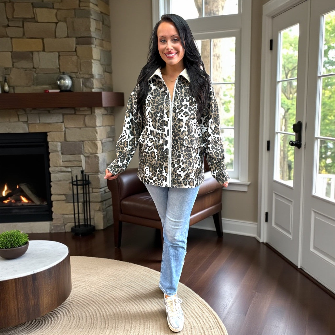 Leopard Printed Washed Twill Cotton Jacket - Contrast Corduroy Collar - Long Sleeve - Front Zipper - Front Patch Pocket97% Cotton 3% Viscose true to size