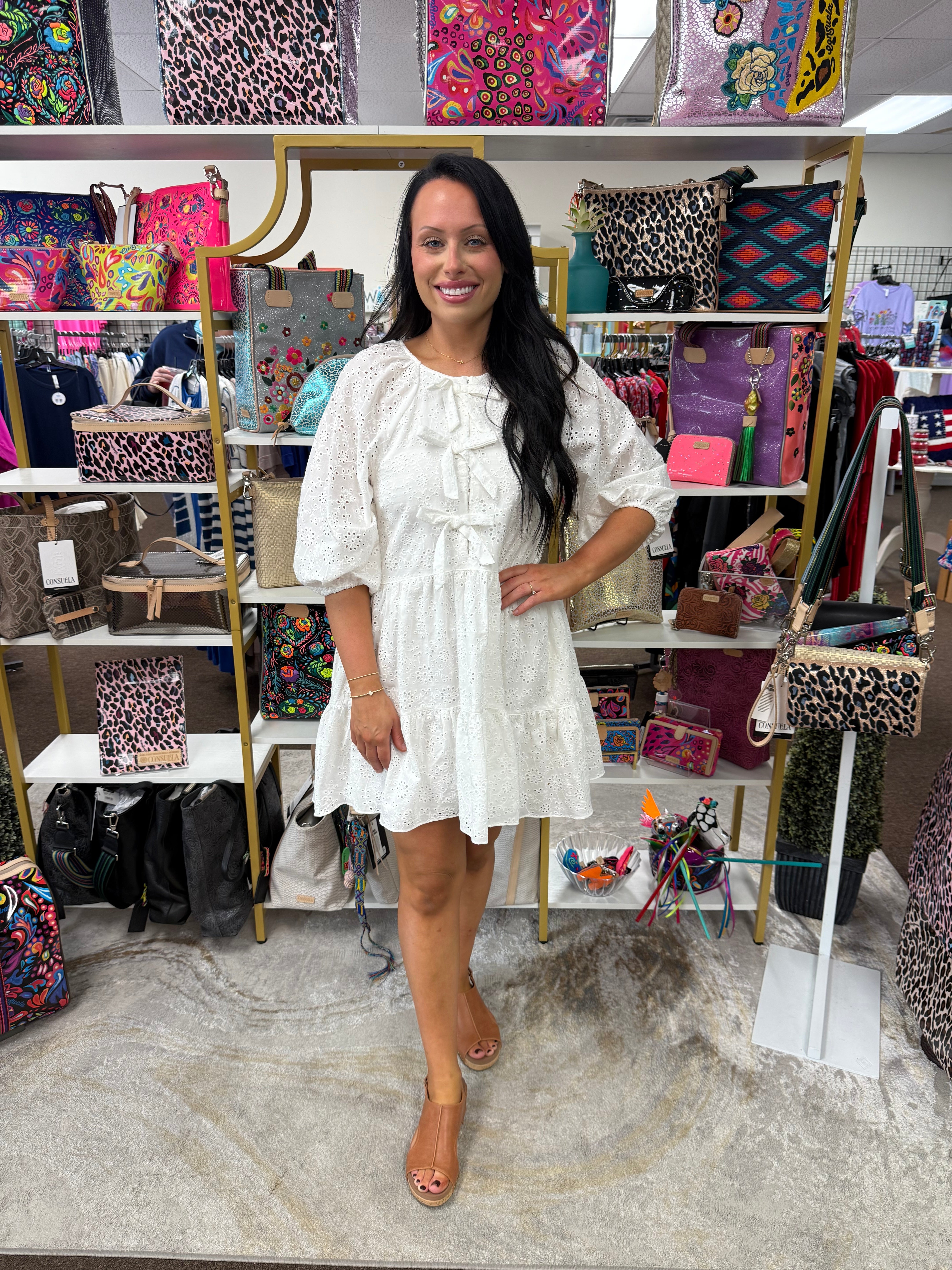 Score some major style points with the Luck of the Day White Dress! This eyelet bow dress is perfect for brides, offering a timeless and classy look with a touch of playfulness. Lightweight and easy to wear, it's the perfect dress for any special occasion.