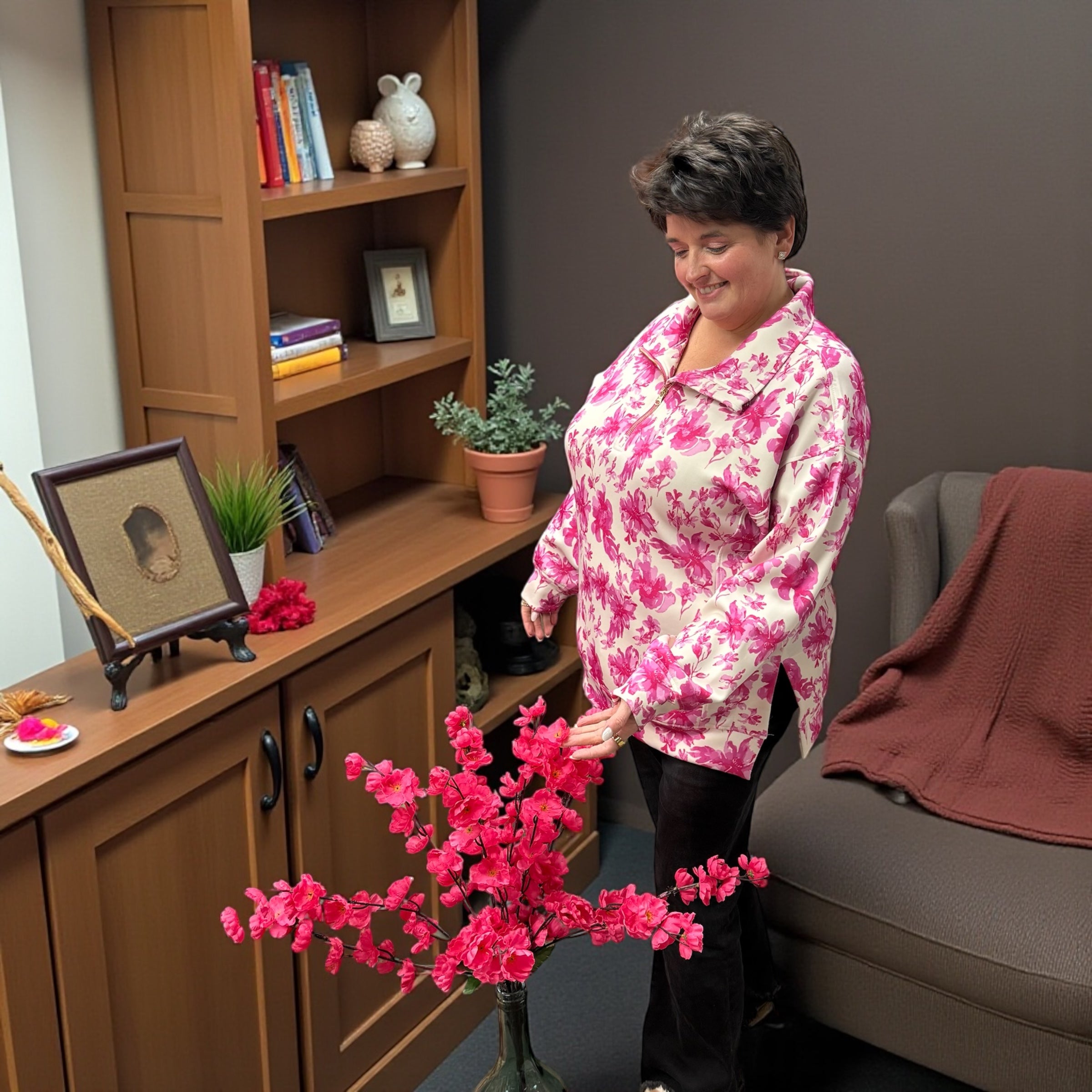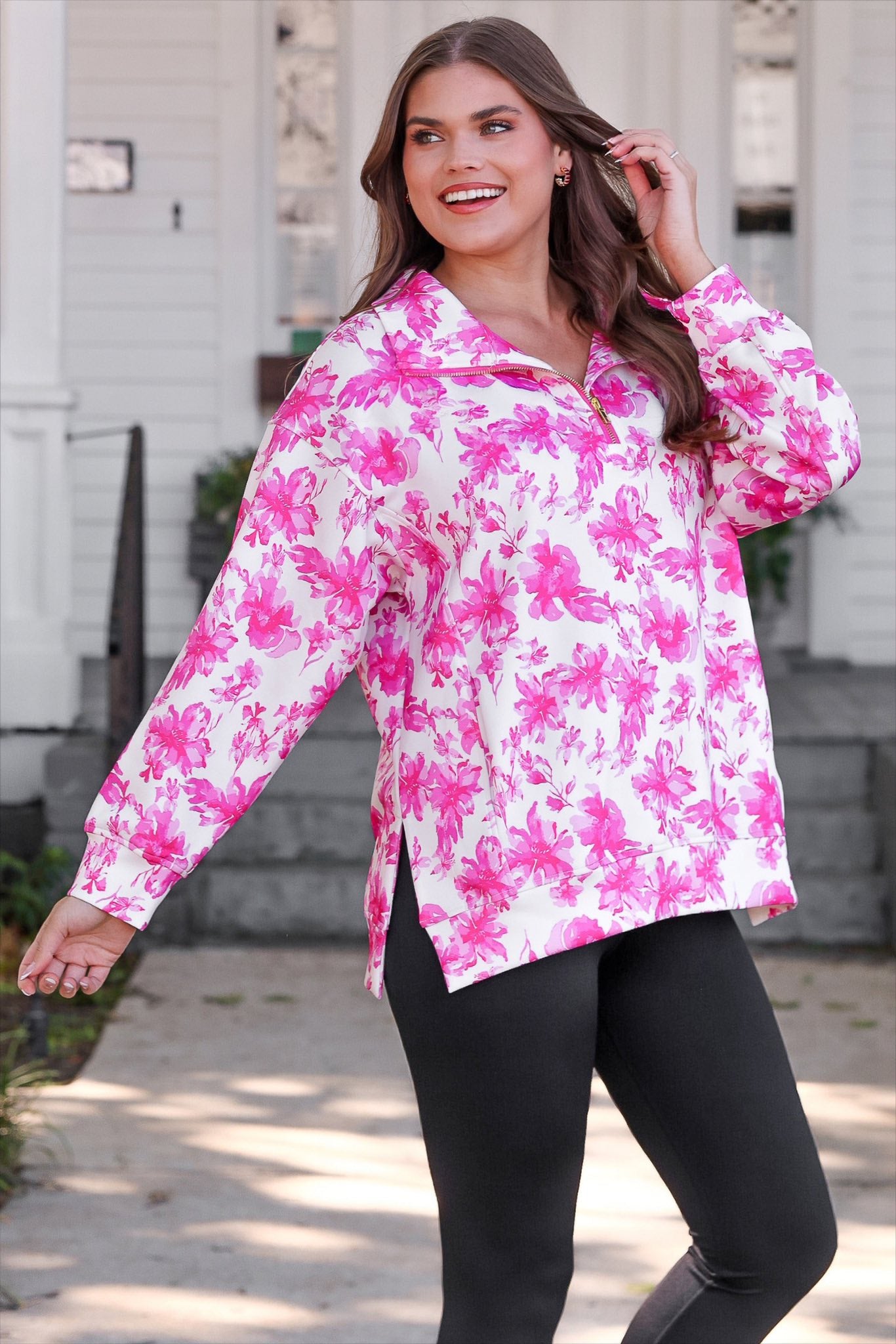 Wrap yourself in elegant comfort with our Everyday Pullover- Pink Regal Blossom. This stylish pullover showcases a stunning pink floral pattern, highlighted by a gold quarter zip. Designed for all-day wearability, it's your new go-to for casual chic. Secure yours now through preorder and be the first to flaunt this charming addition to your collection.