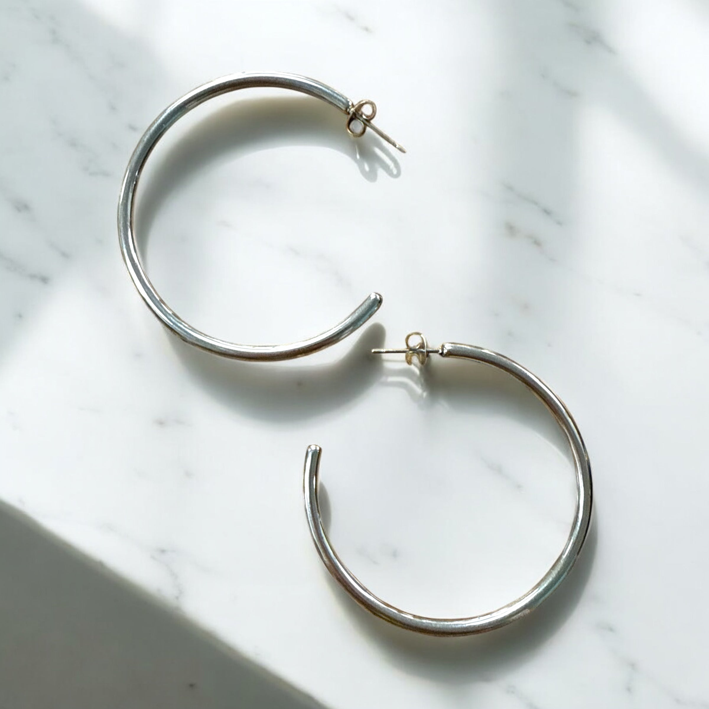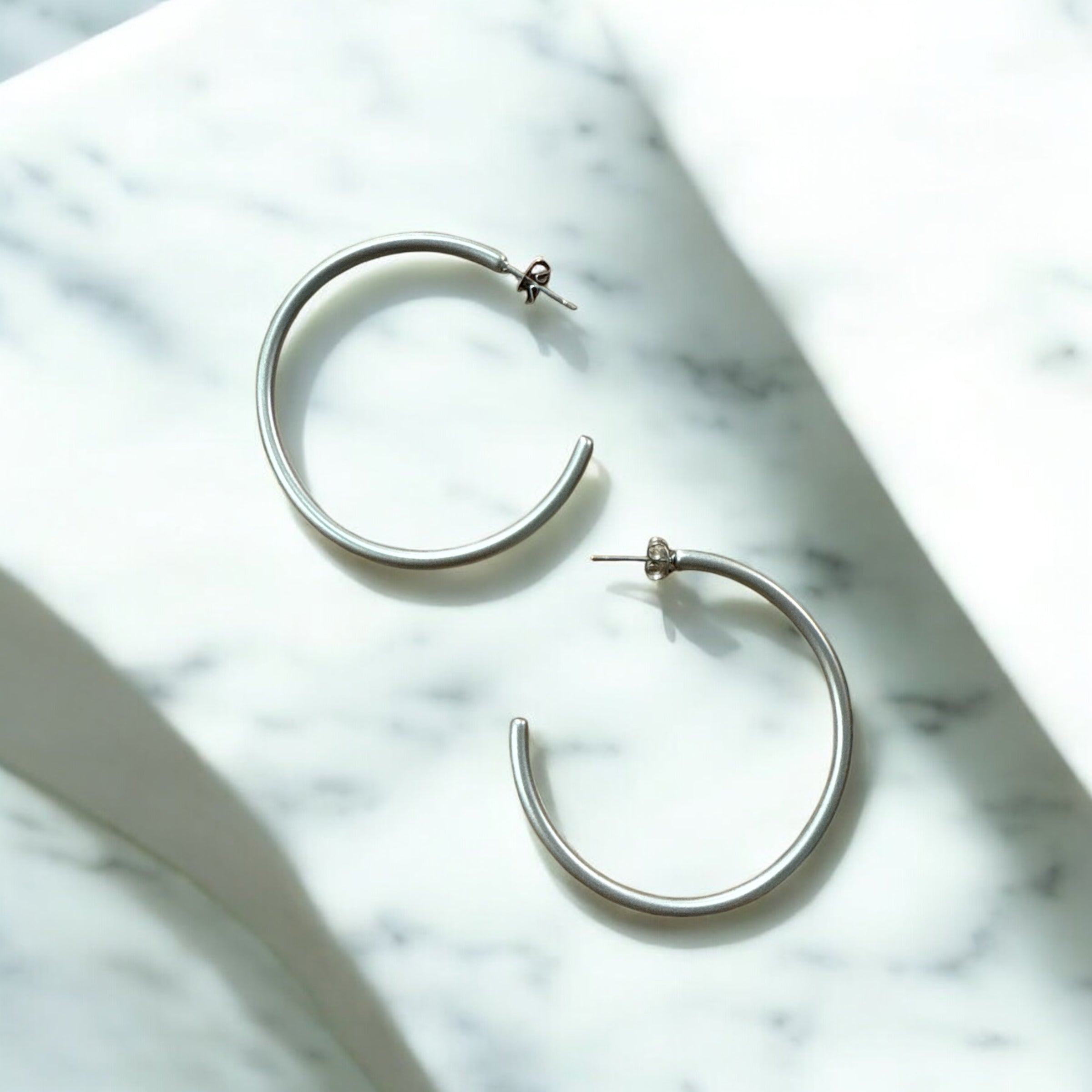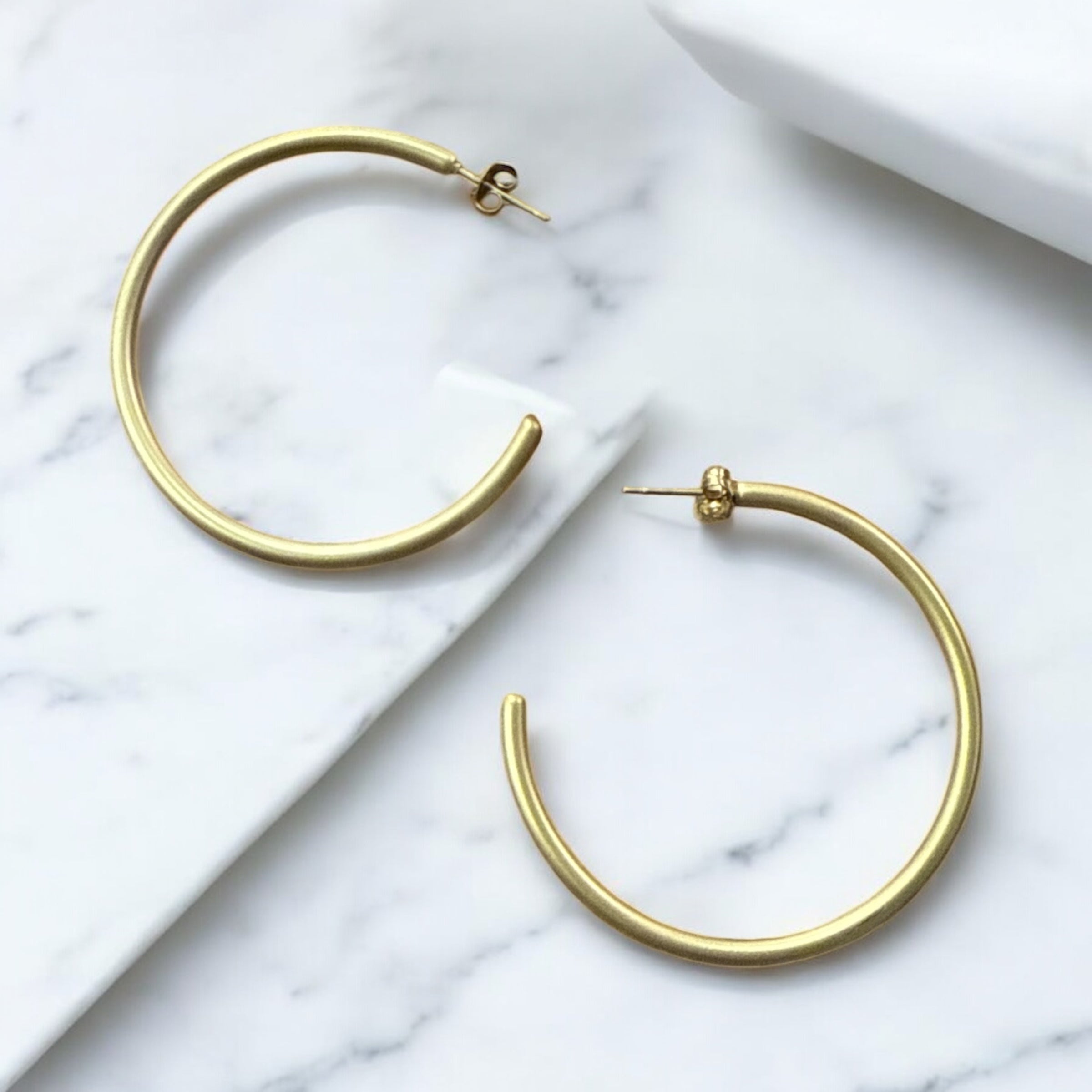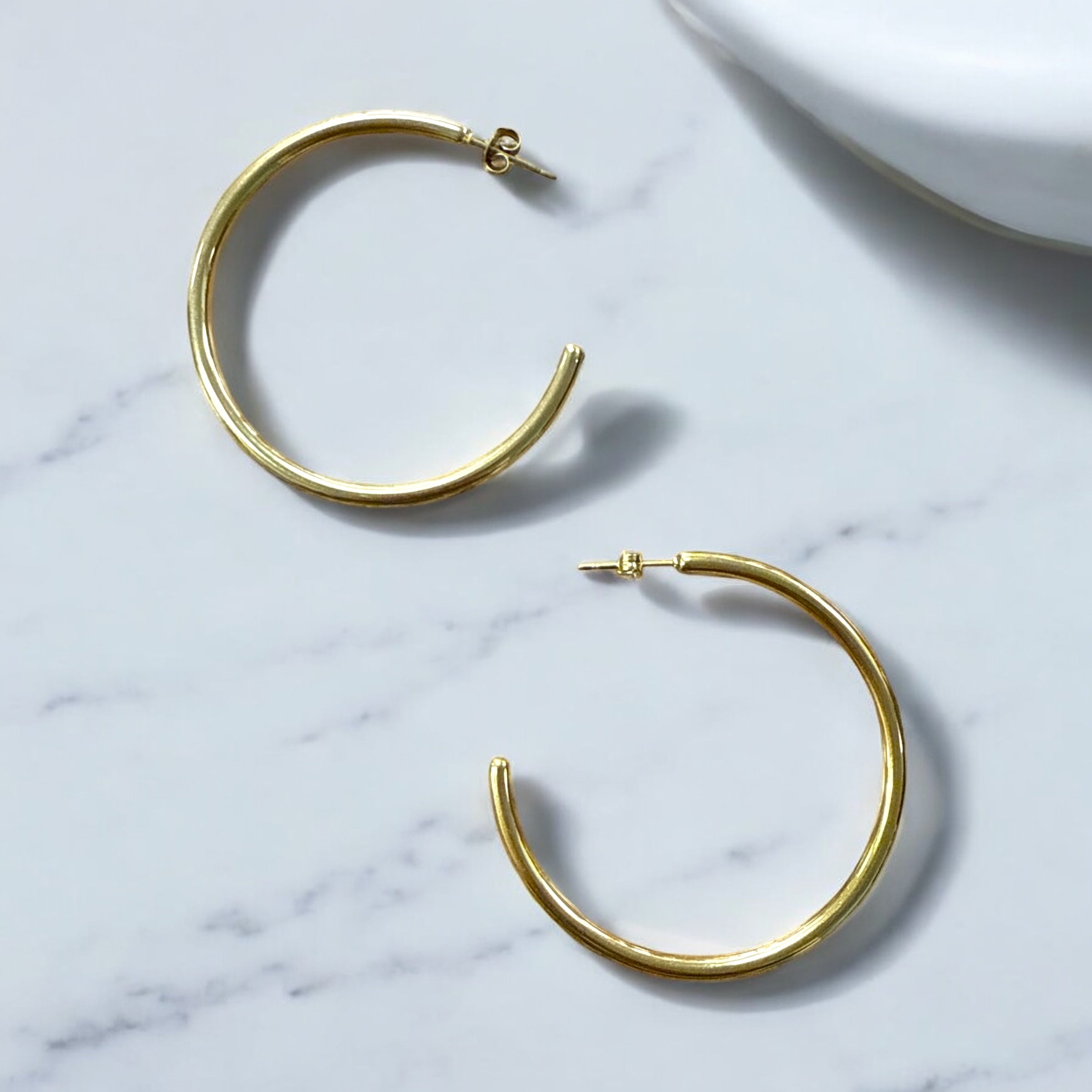 Elevate your style with the Jackie Hoop, a versatile 50mm medium open hoop with a 3MM thickness. These water-resistant earrings come in four luxurious finishes: Brushed Gold, Brushed Silver, Shiny Gold, and Shiny Silver. Perfect for making a statement whether you're poolside or out for the evening. Add this timeless accessory to your collection today.