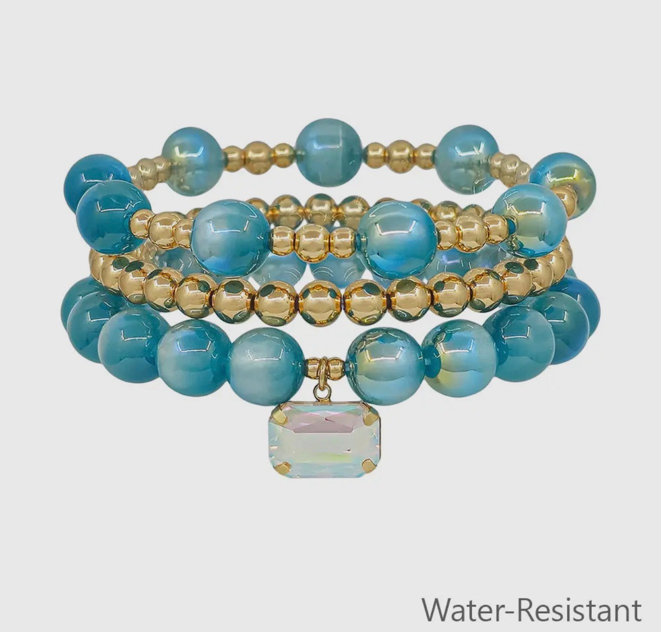 Blue/Mint Beaded and Gold Set of 3 with Square Crystal Charm Stretch Bracelets. This jewelry set features Blue/Mint beads elegantly complemented by gold accents, with a square crystal charm adding a touch of sophistication.