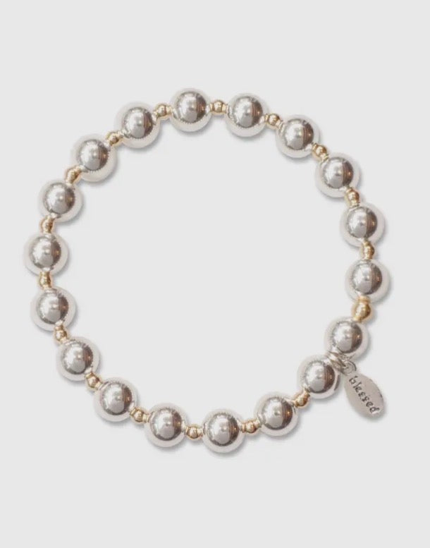 A natural compliment to the original Blessing Bracelet, the Count Your Blessings bracelet is a classic design that looks elegant when worn alone, or mixed in stacks of bracelets – and is made for easy, stretchable fit of 8mm Sterling silver beads and a "Blessed" charm, with 3mm gold-filled accent beads. Strung on Stretch Nylon