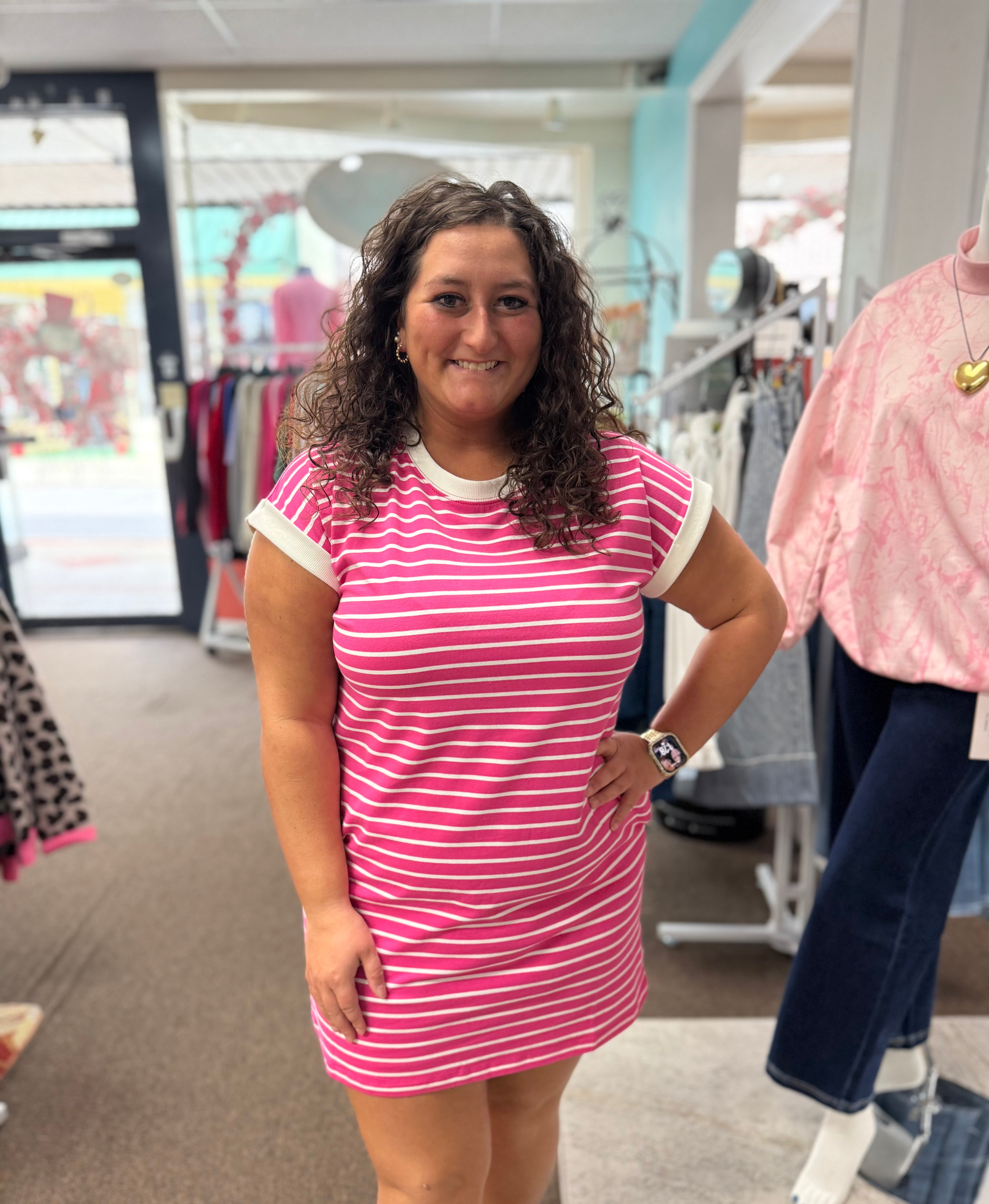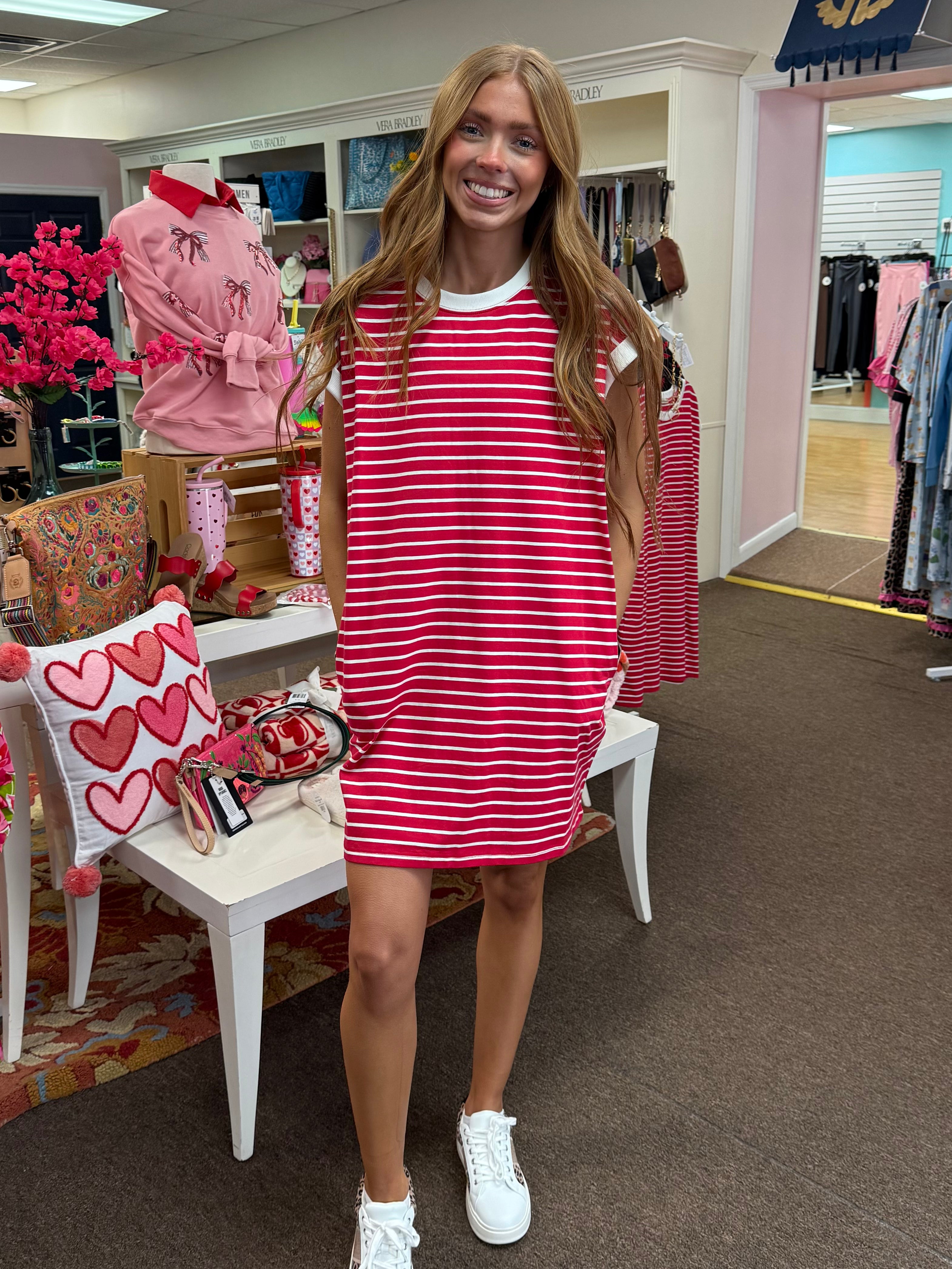 Stripes meet style in this charming t-shirt dress featuring bold contrast trim that frames the neckline and sleeves with personality. Cut to a relaxed, flattering silhouette, it hits at an easy 33" length—perfect for pairing with sneakers or sandals. Practical front pockets keep your essentials close while you move through your day. With a generous 42" chest measurement, this dress offers comfortable room to breathe. A versatile wardrobe essential that works as hard as you do, with twice the fun.