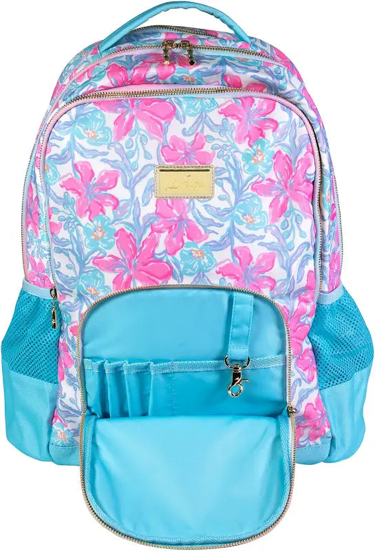 We’ve got your back with this spacious backpack in Beachside Haven. This backpack boasts adjustable straps, mesh pockets, bamboo zipper pulls, interior and exterior pockets, and a gold logo plaque