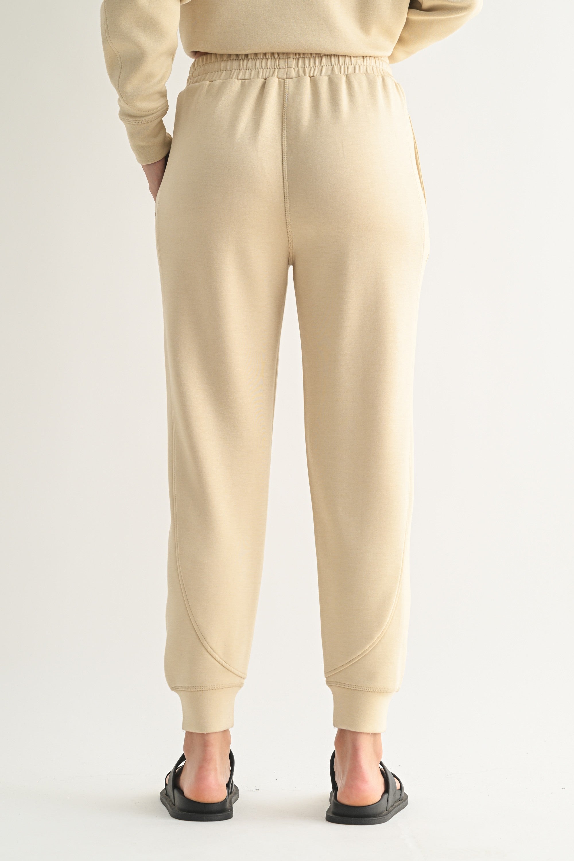 Elevate your wardrobe in these buttery smooth joggers. They feature contrasting swoop seam that runs down the leg and ends with cuffed ankles and pockets.